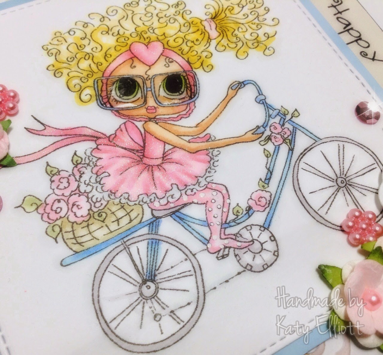 Here's a card I made using a Sherri Baldy digistamp image, which I coloured with spectrum noir pens and added some embellishments to.